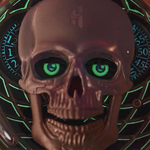 At its center lies a handcrafted and hand-painted 925 sterling silver skull. The left eye displays the hour, the right eye shows the minutes, and the jaw mechanism moves at the top of every hour. In addition, the eye-opening and closing effect adds a captivating touch to the design.